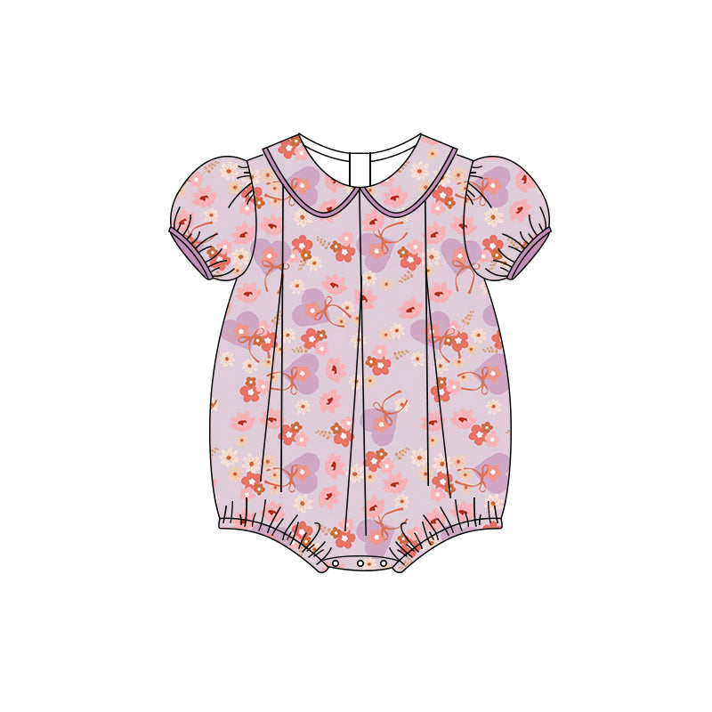 Preorder (moq 5)Baby Girls Lavender Short Ruffle Sleeves Hearts Flowers Rompers