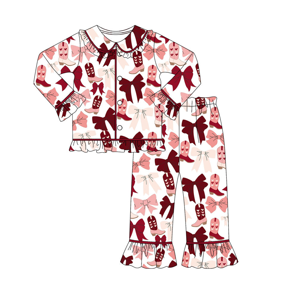 Preorder (moq 5)Baby Girls Dark Red Bows Boots Button Top Ruffle Pants Pajamas Sets