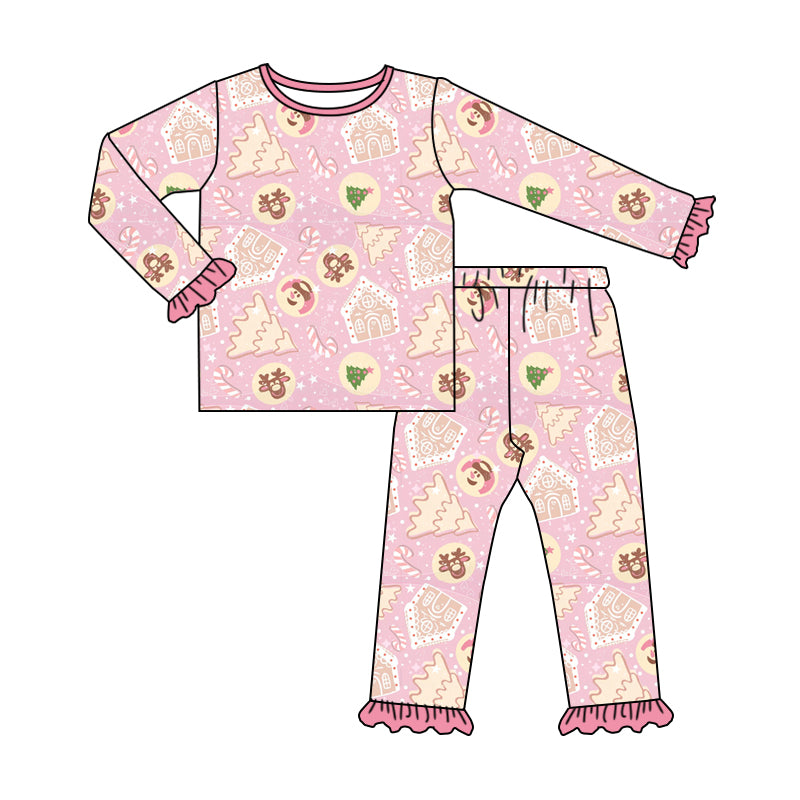 Preorder (moq 5)Baby Girls Pink Long Ruffle Sleeves Deer Trees Plaid Top Pant Pajamas Sets