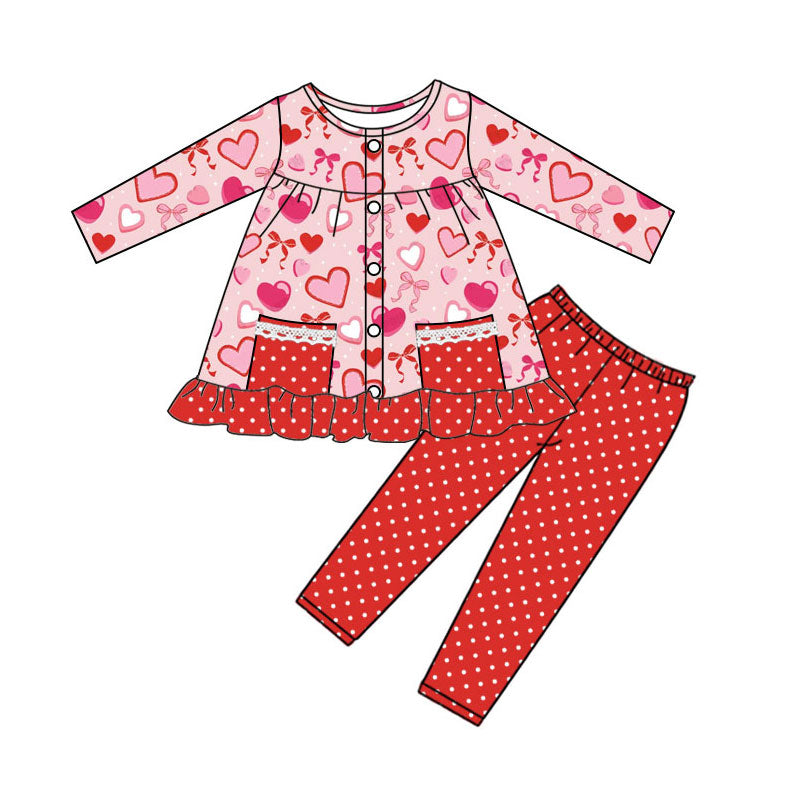 Preorder (moq 5)Baby Girls Red Hearts Bows Button Pockets Tunic Leggings Pant Valentine Clothes Sets
