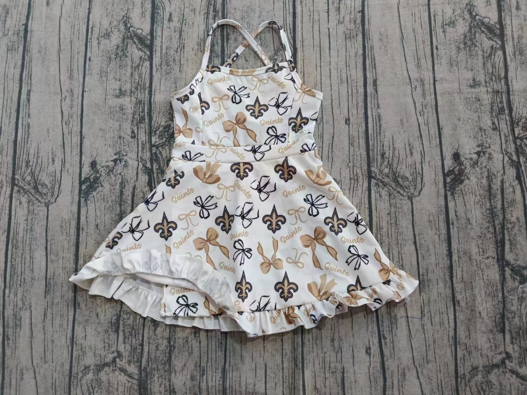 Preorder (moq 5)Baby Girls Straps Yellow Bows Plaid Saints Shorts Ruffle Team Knee Length Dresses