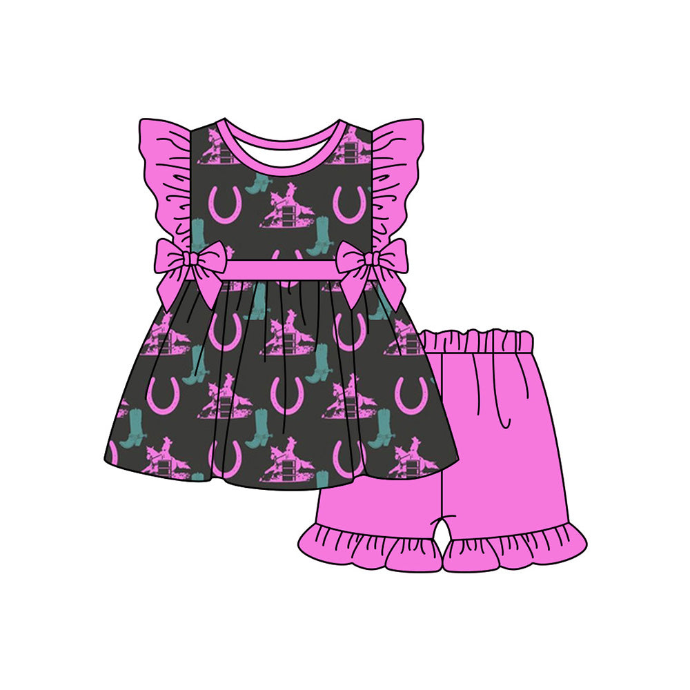 Preorder (moq 5)Baby Girls Western Rodeo Bows Tunic Top Ruffle Shorts Clothes Sets
