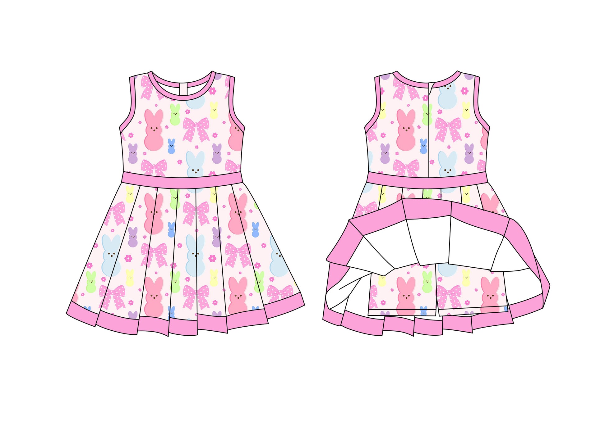 Preorder moq 8 Baby Girls Colorful Rabbits Flowers Back Zip Shorts Easter Ruffle Knee Length Dress