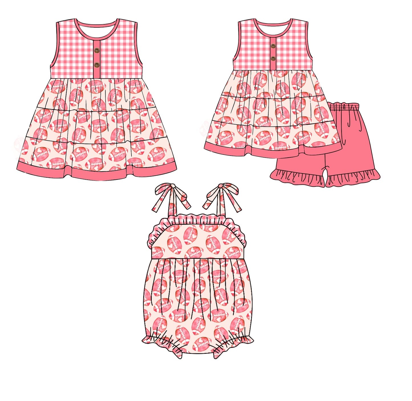Preorder(moq 5 each)Sibling Baby Girls Pink Football Checkered Spring Romper Dress Shorts Sets