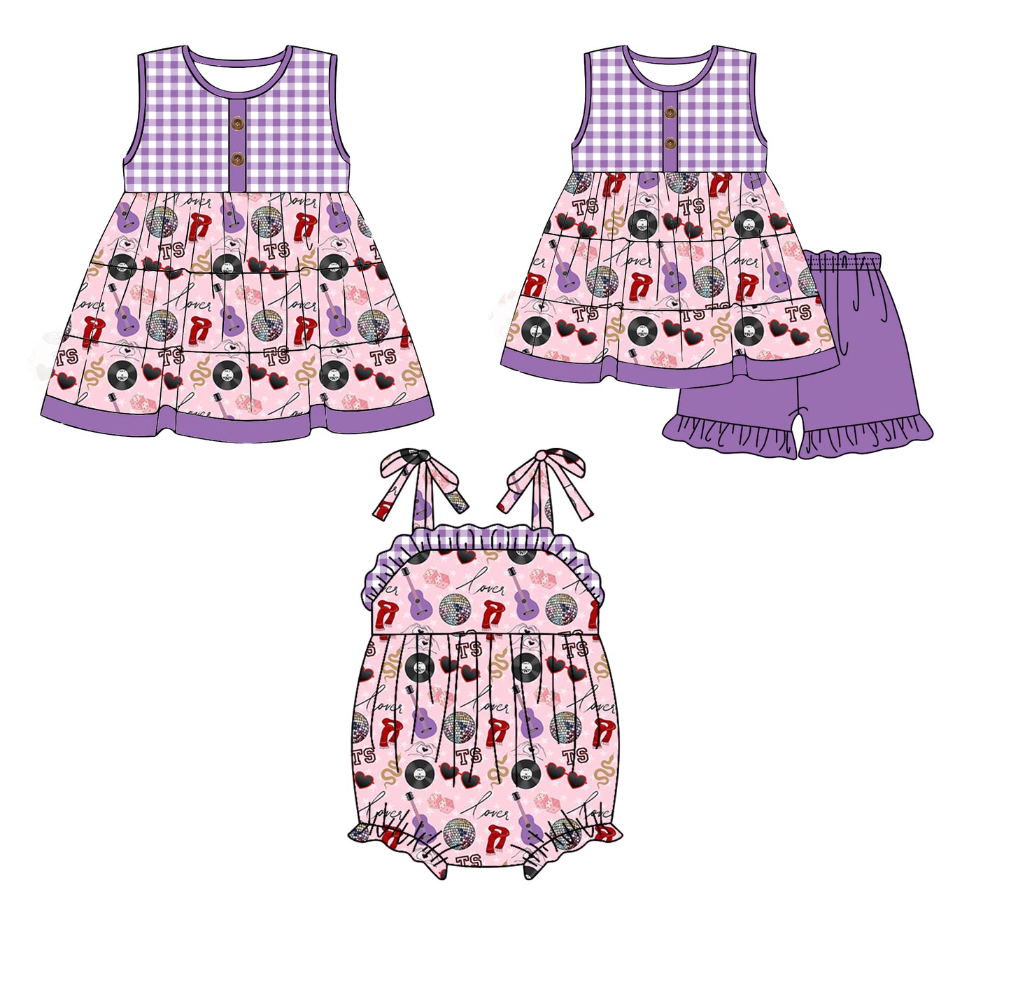 Preorder(moq 5 each)Sibling Baby Girls TS Singer Purple Checkered Spring Romper Dress Shorts Sets