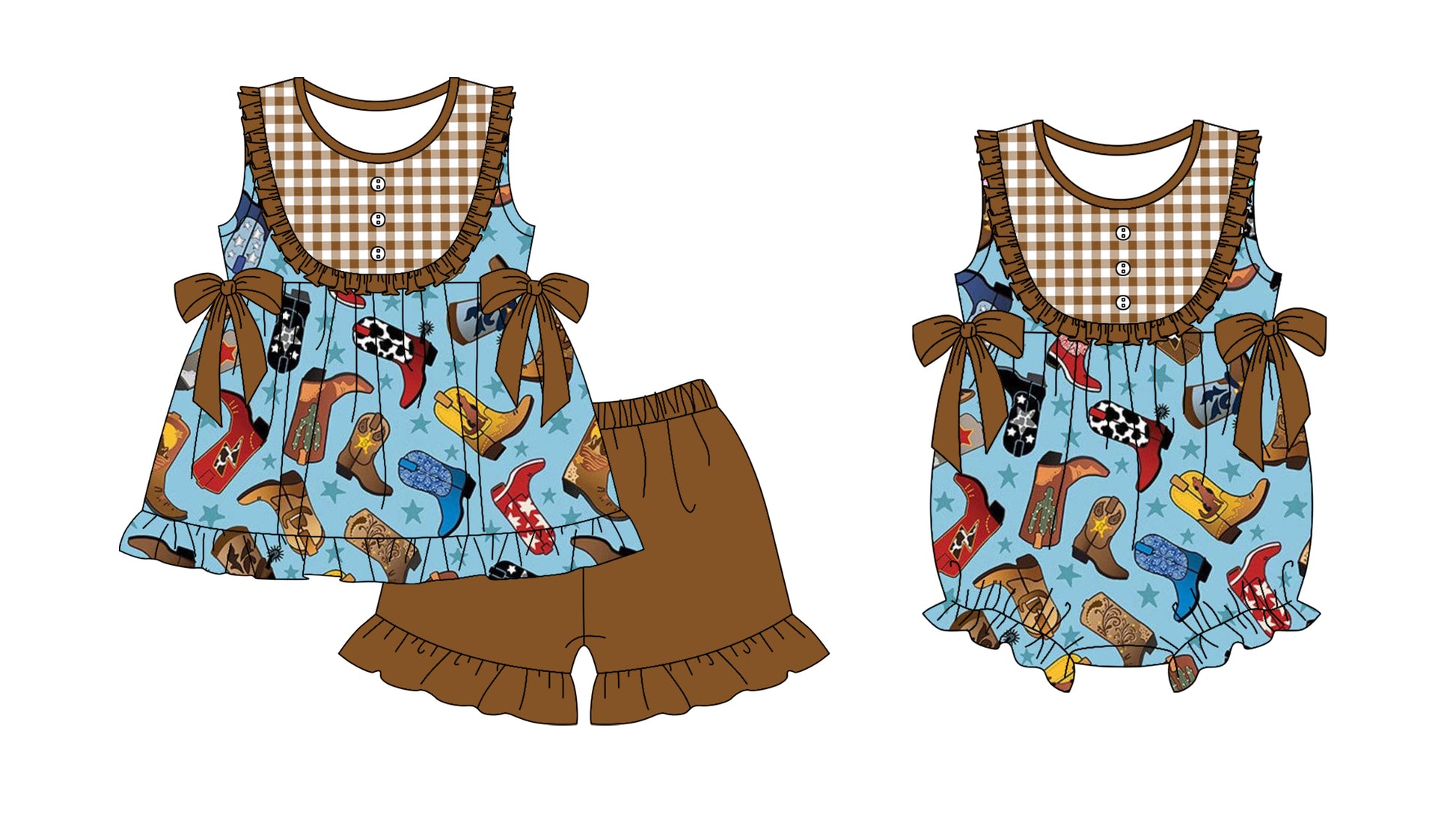 Preorder(moq 5 each)Sibling Baby Girls Western Boots Stars Tunic Top Shorts Bows Rompers Clothes Sets
