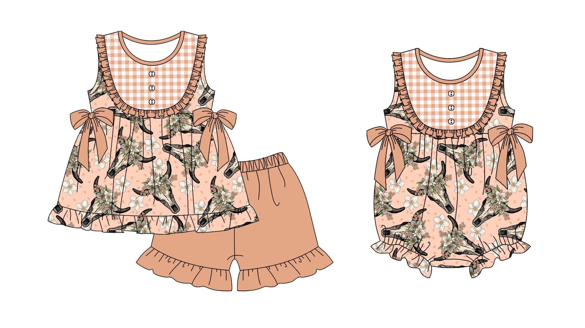 Preorder(moq 5 each)Sibling Baby Girls Western Cow Skull Tunic Top Shorts Bows Rompers Clothes Sets