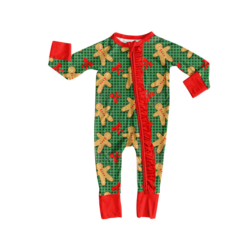 Preorder(moq 5)Baby Girls Green Checked Bows Gingerbread Christmas Zipper Footie Rompers