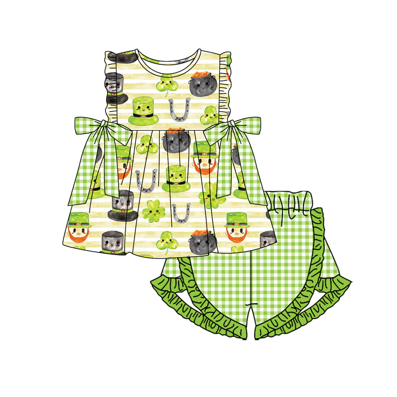 Preorder(moq 5)Baby Girls St Patrick Day Quatrefoil Top Ruffle Shorts Clothes Sets