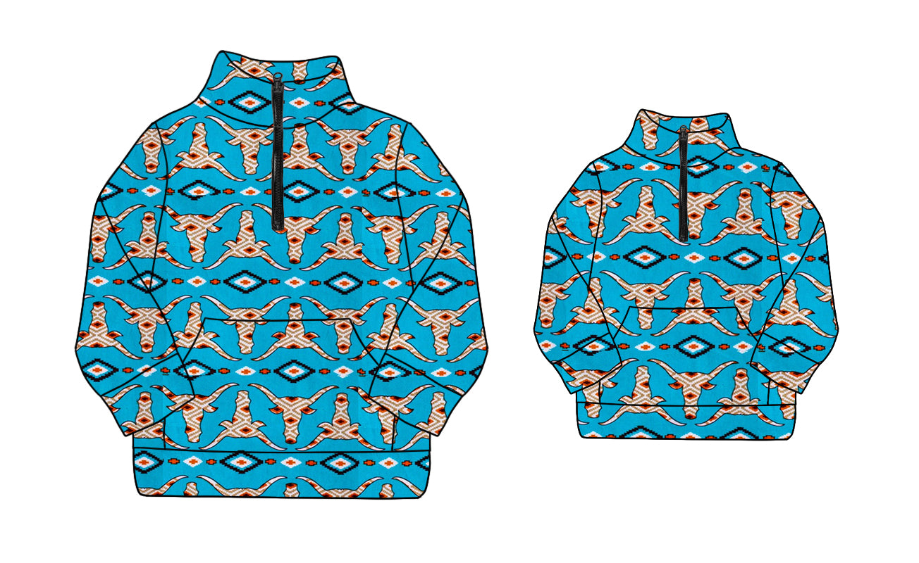 Preorder(moq 5)Mama and Me Long Sleeves Aztec Bull Skull Pocket Zipper Pullovers Top