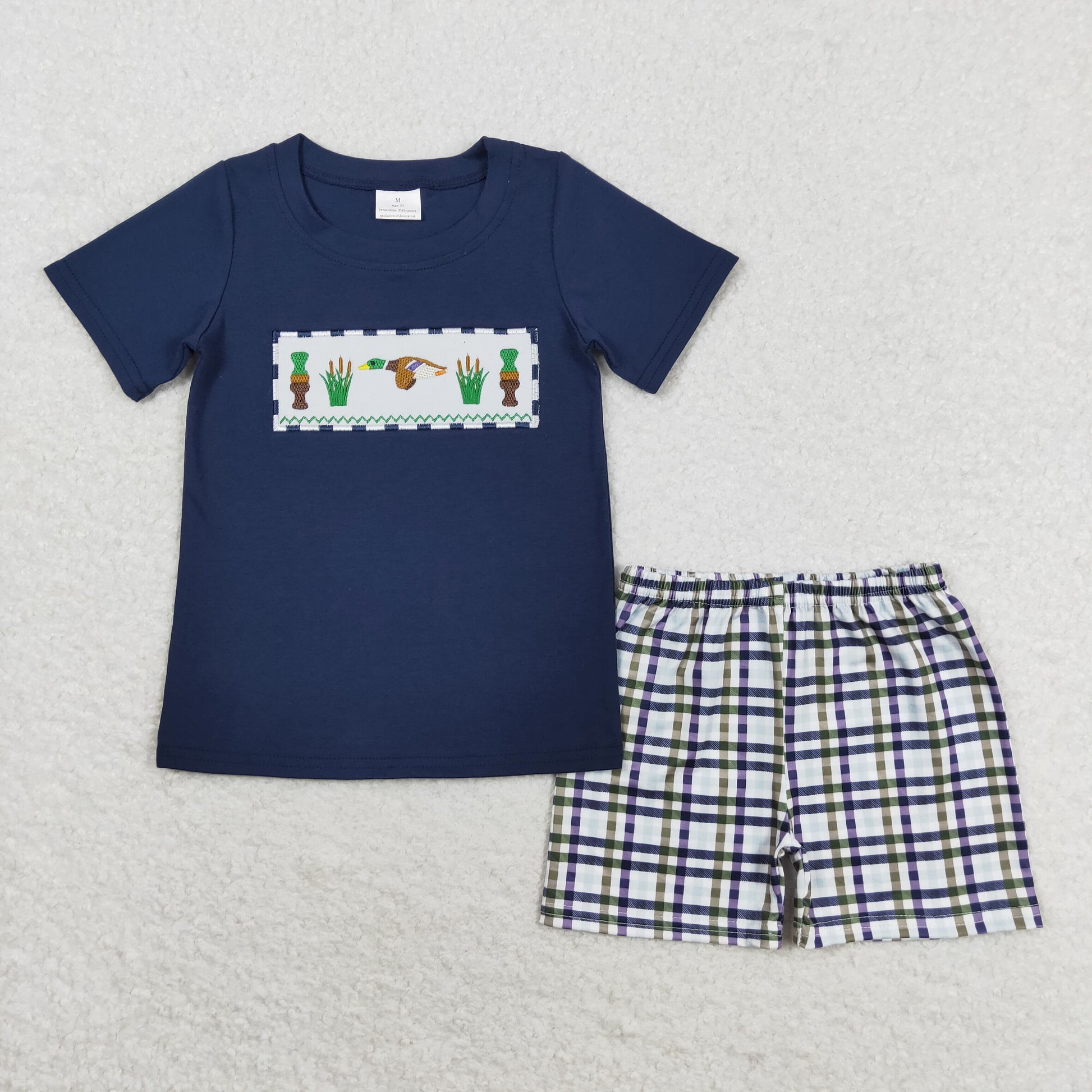 Sibling Baby Boys Embroidery Ducks Calls Top Blue Checked Shorts Hunting Clothes Set Romper
