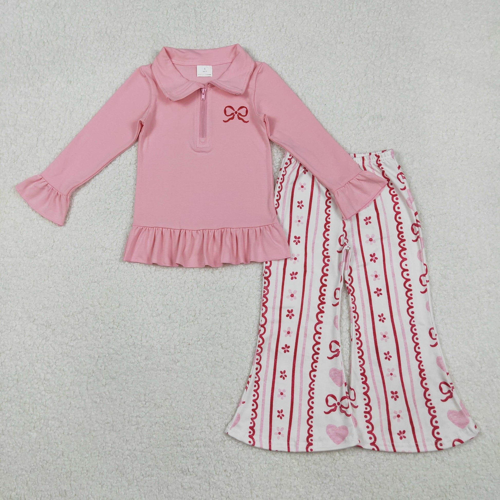 Sibling Baby Girls Embroidery Hearts Bows Zip Pullovers Flare Pants Valentines Clothes Sets