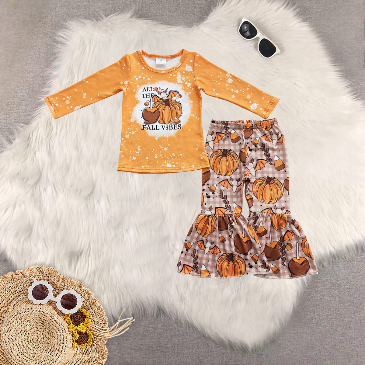 Sibling Baby Girls Fall Yellow Long Sleeves Pumpkin Top Bell Pants Clothes Sets