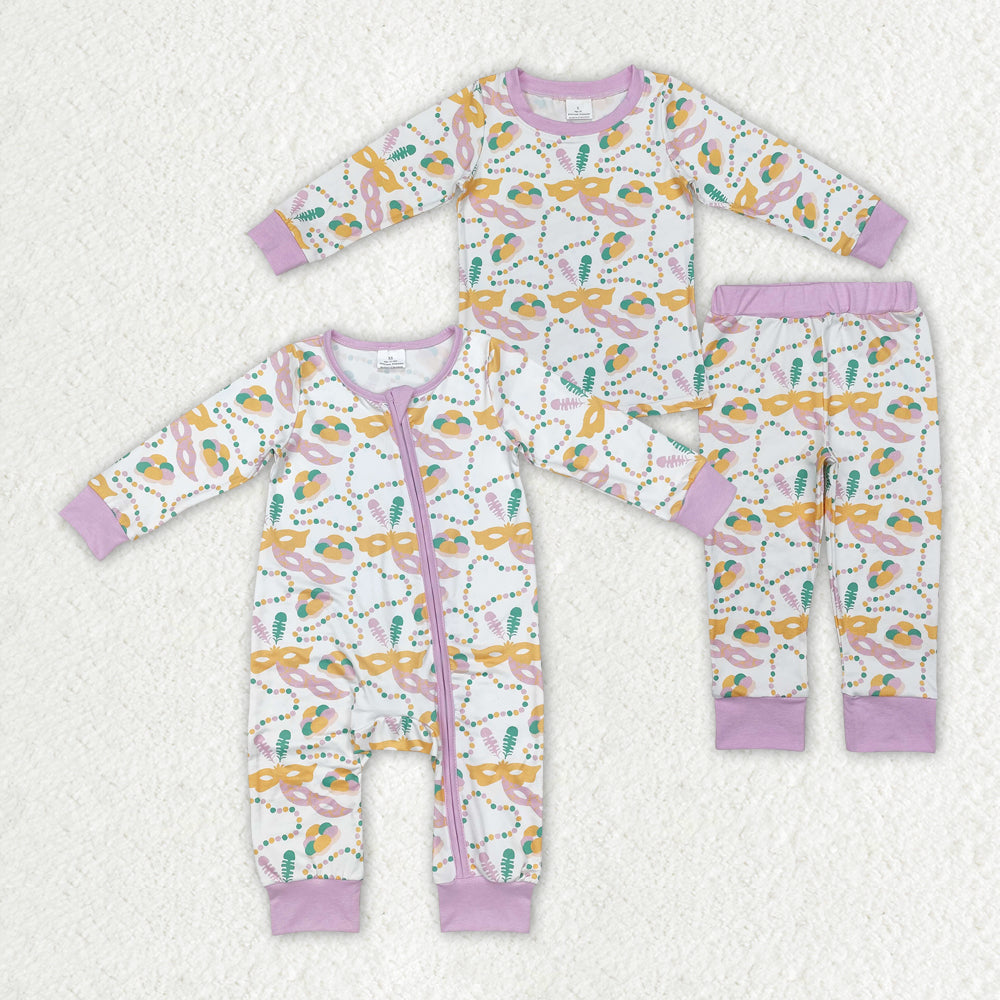 Sibling Baby Girls Mardi Gras Masks Lavender Rompers Pajamas