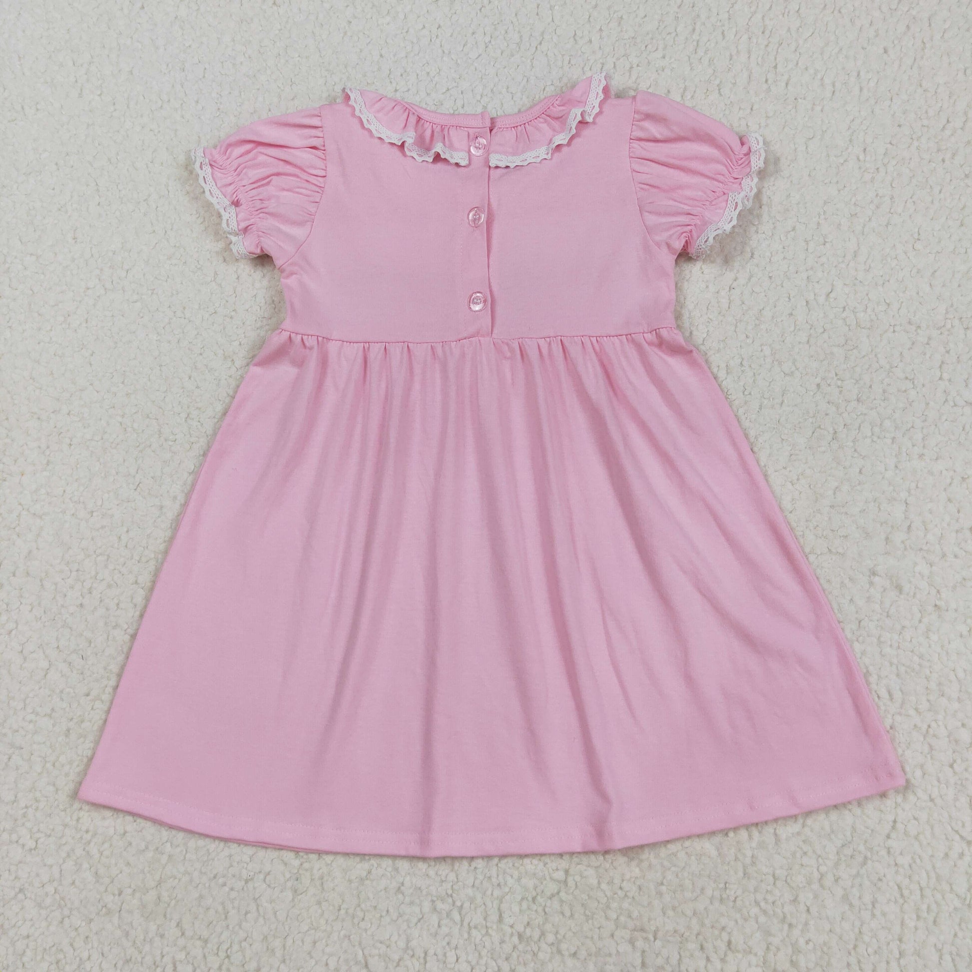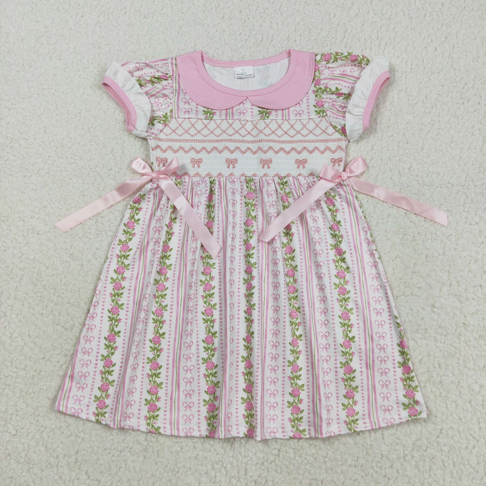 Sibling Baby Girls Pink Smocked Embroidery Bows Flowers Ruffle Sleeve Collar Knee Length Dresses