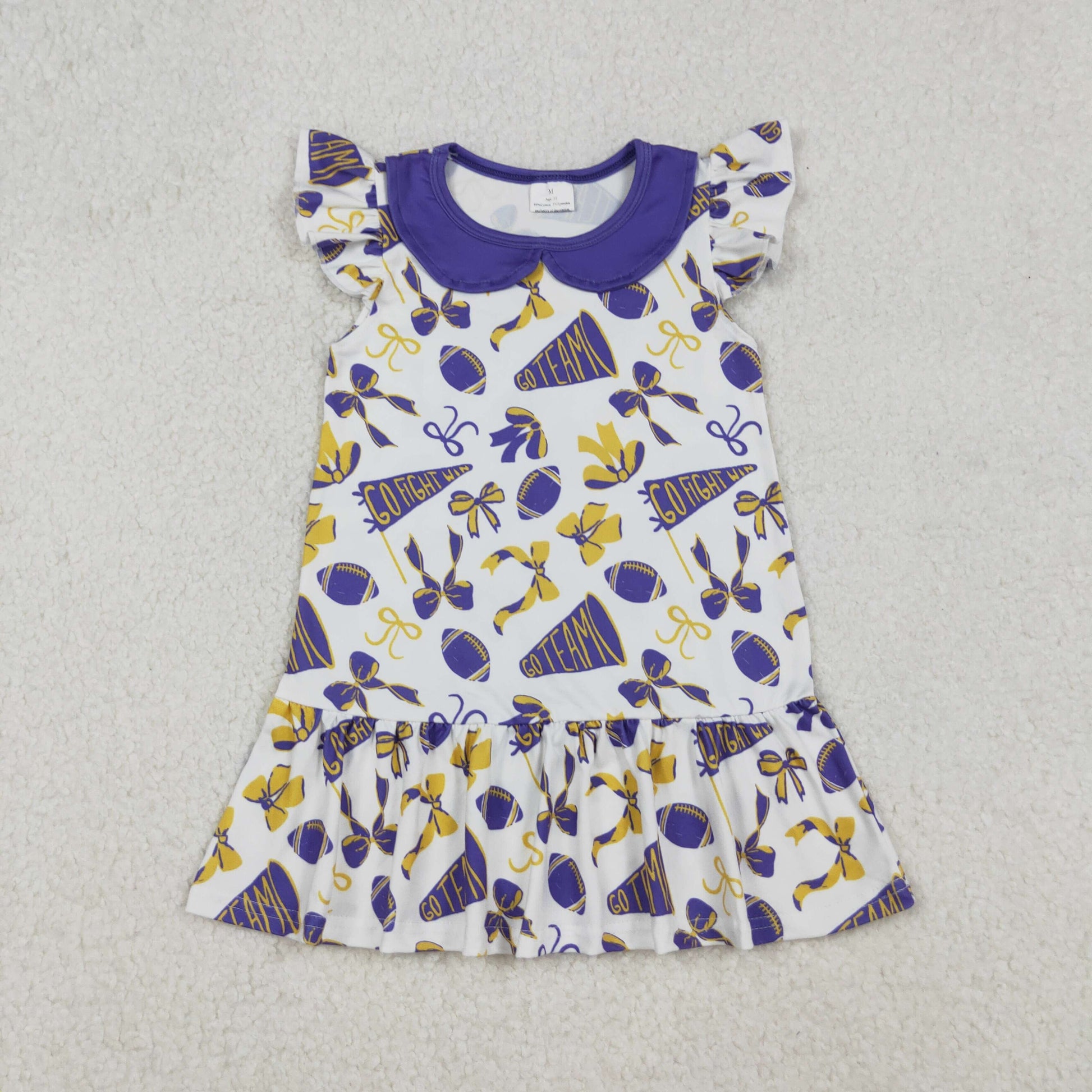 Sibling Baby Girls Purple Bows Footballs Go Team Ruffle Zipper Romper Knee Length Dresses