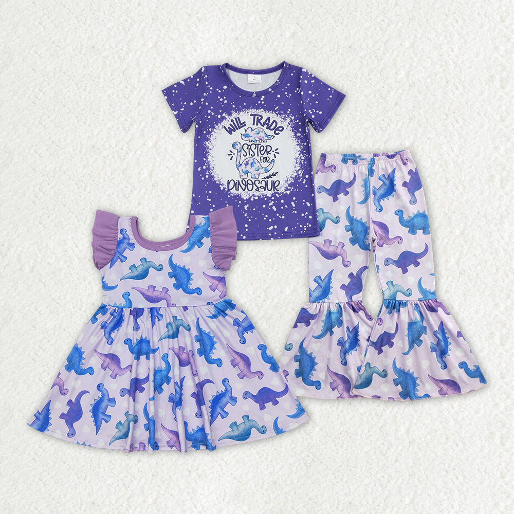 Sibling Baby Girls Purple Dinosaur Dresses Clothes Sets