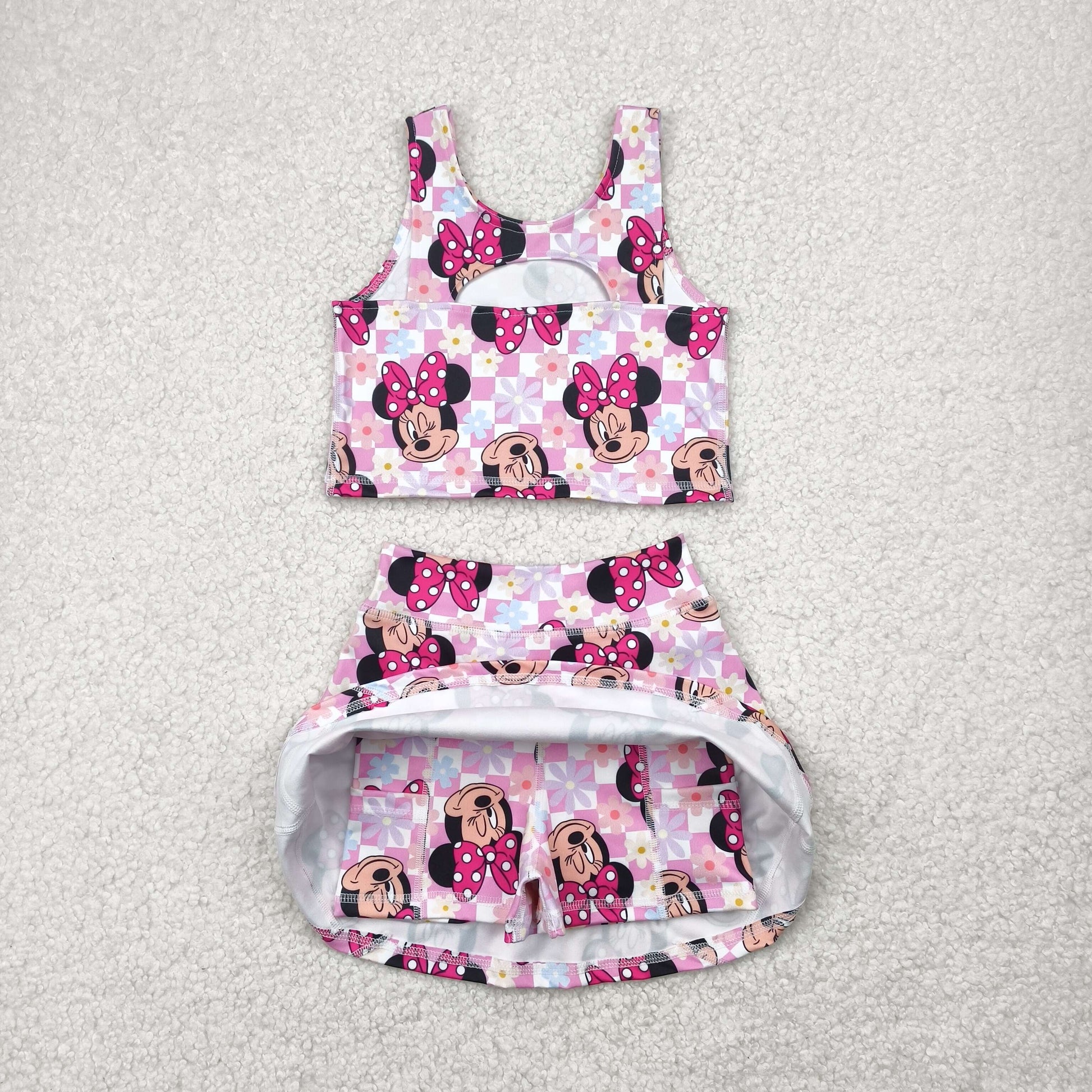 Sibling Baby Girls Sleeveless Pink Plaid Cartoon Mouse Top Skort Yoga Set Knee Length Dress