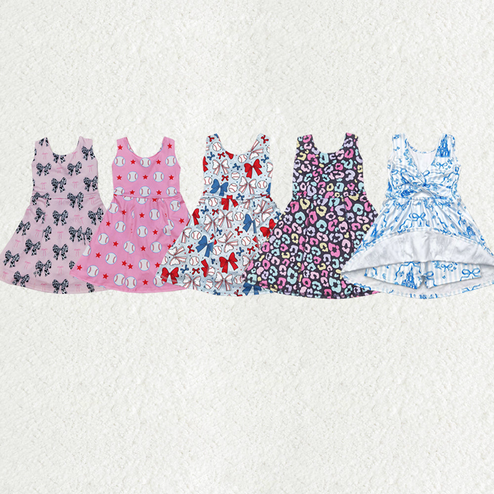 Sibling Baby Girls Strap Bows Baseballs Floral Skorts Yoga Knee Length Dresses