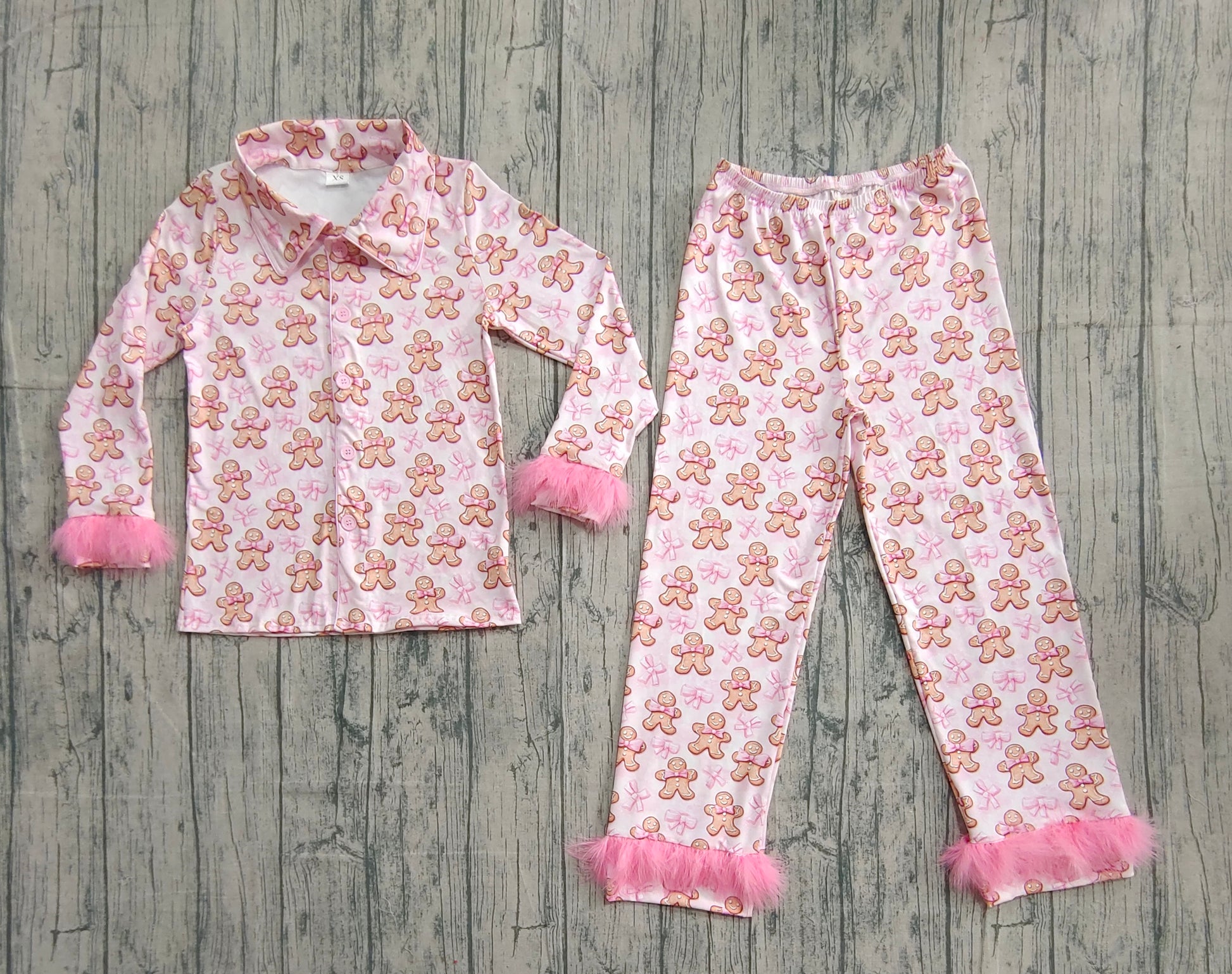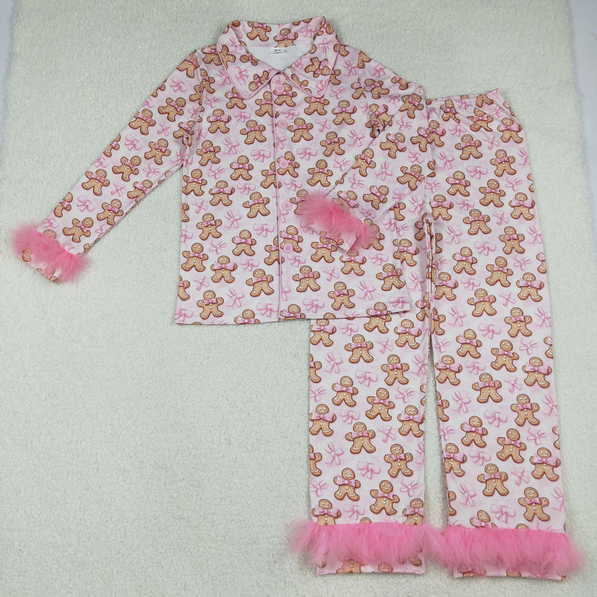 Adult Women Bows Gingerbread Button Top Pants Christmas Fur Pajamas Set