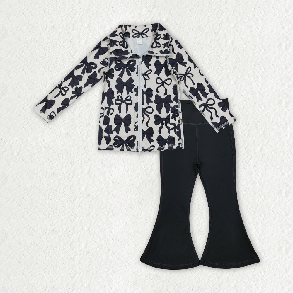 Baby Girls Black Bows Plaid Zipper Pullover Bell Bottom Pants Yoga Active Clothes Sets