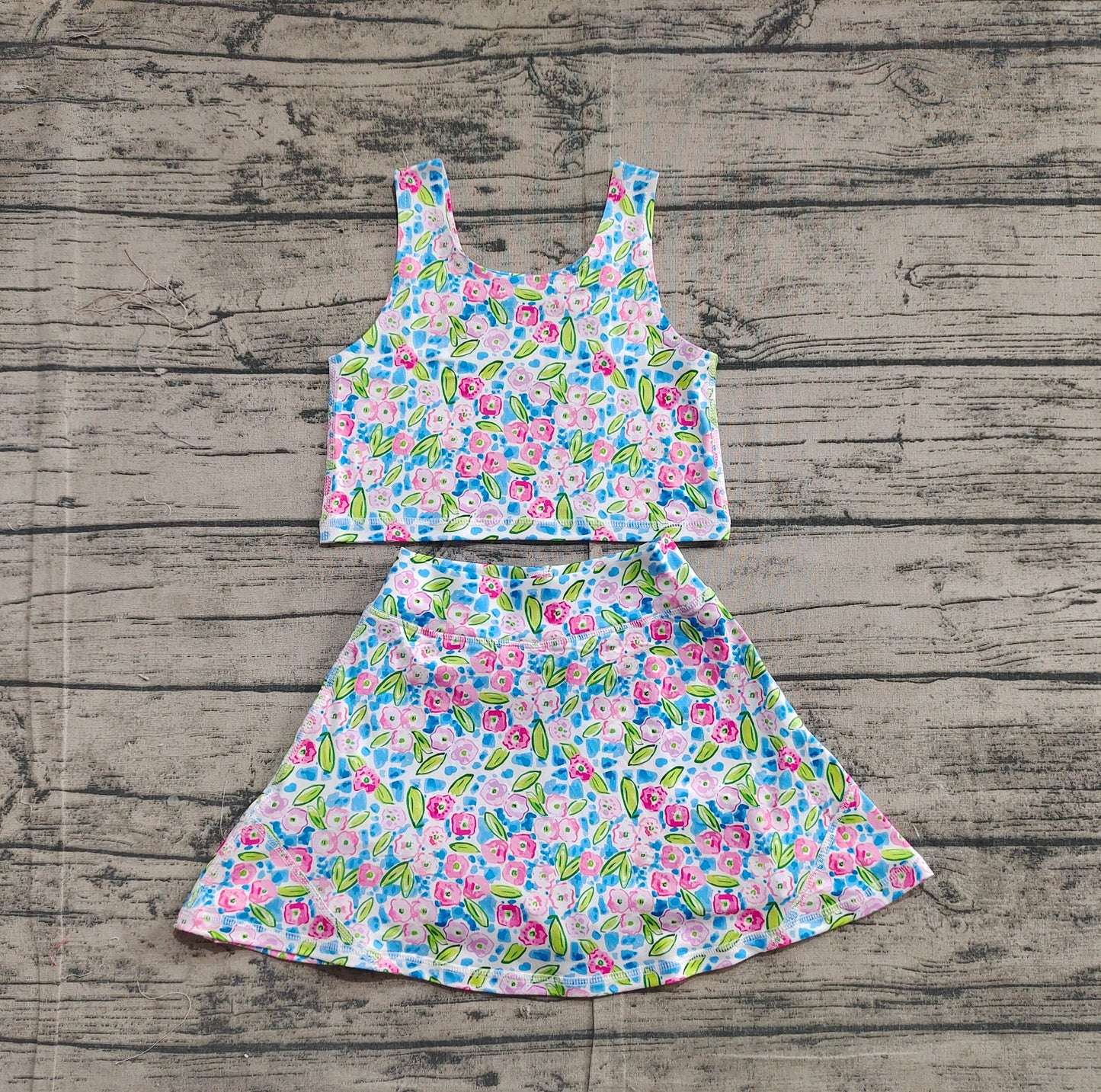 Baby Girls Blue Pink Floral Vest Top Shorts Skirts Yoga Activity Set