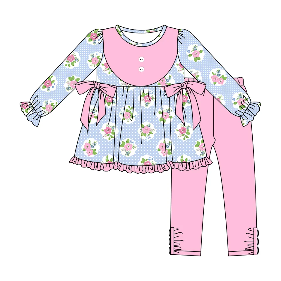 Baby Girls Blue Pink Flowers Bows Tunic Pants Legging Clothing Sets Preorder(moq 5)