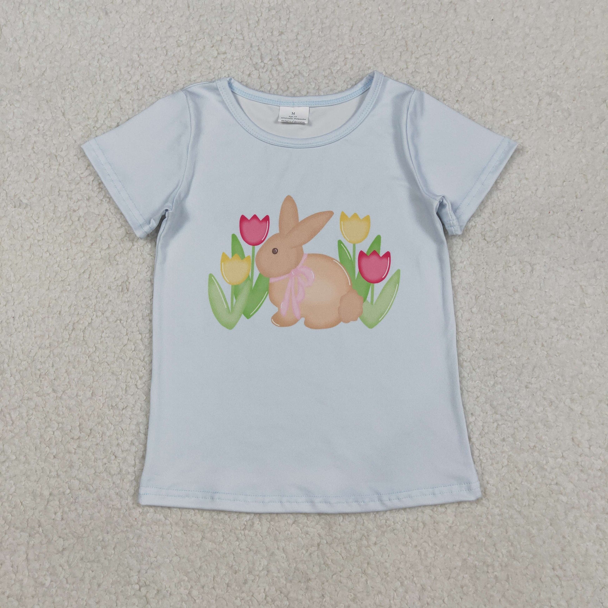 Baby Girls Blue Short Sleeve Flowers Rabbits Easter T-shirts Top