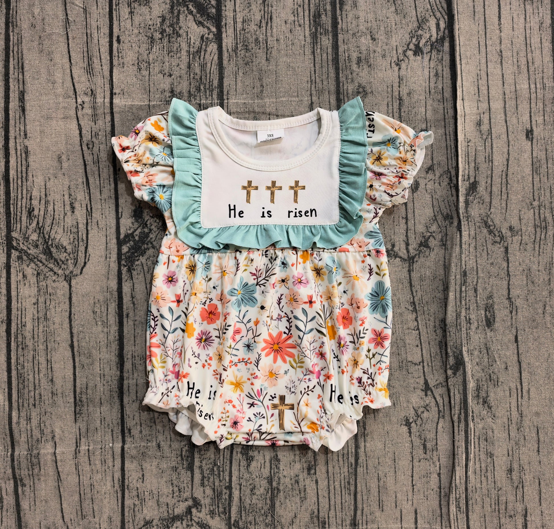Baby Girls Crosses He is Risen Flowers Easter Ruffle Rompers