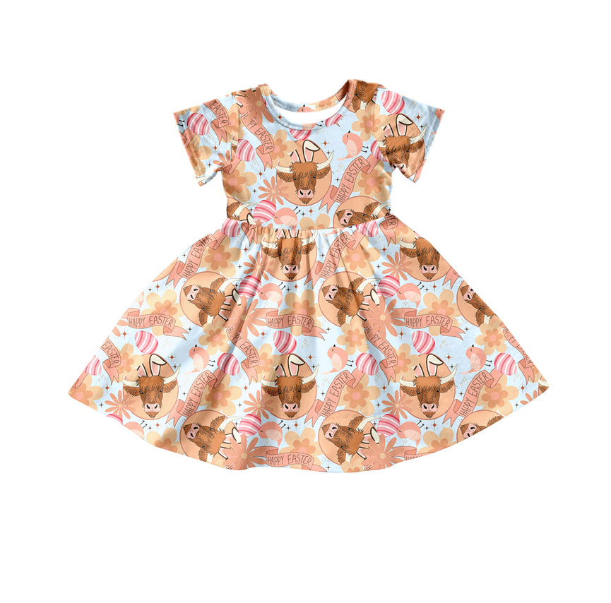 Baby Girls Easter Highland Cow Short Sleeve Knee Length Dresses Preorder(moq 5)