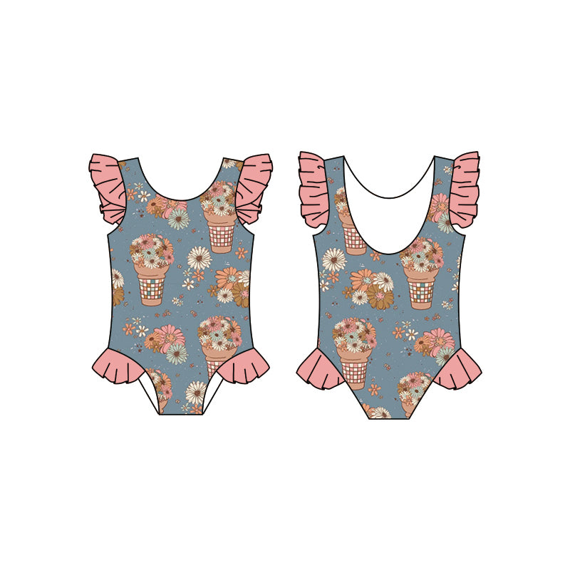Baby Girls Flowers Sleeveless Flutter Sleeve One Piece Ruffle Swimsuits preorder(moq 5)