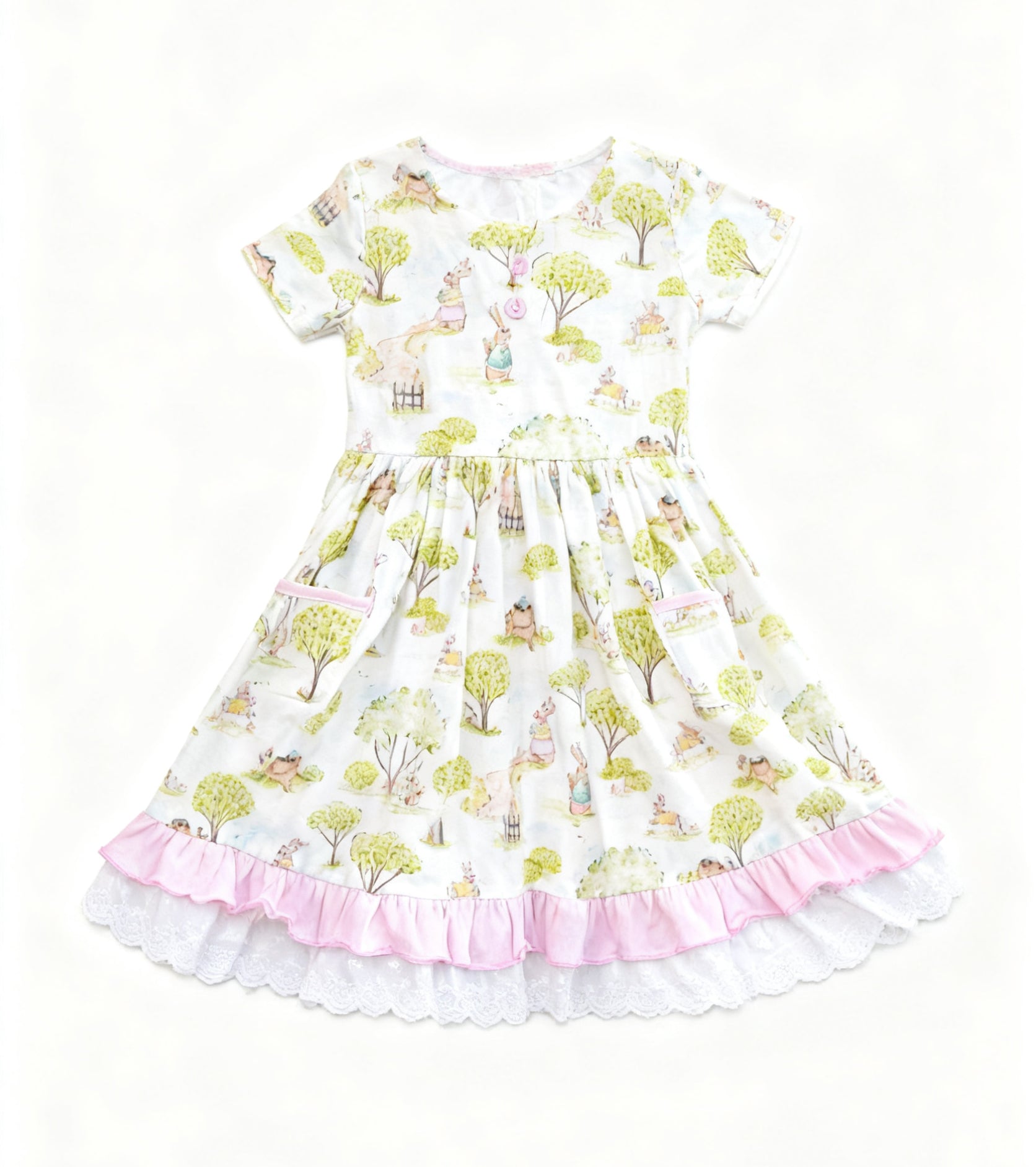 Baby Girls Flutter Sleeve Flowers Rabbits Easter Pockets Ruffle Knee Length Dresses Preorder