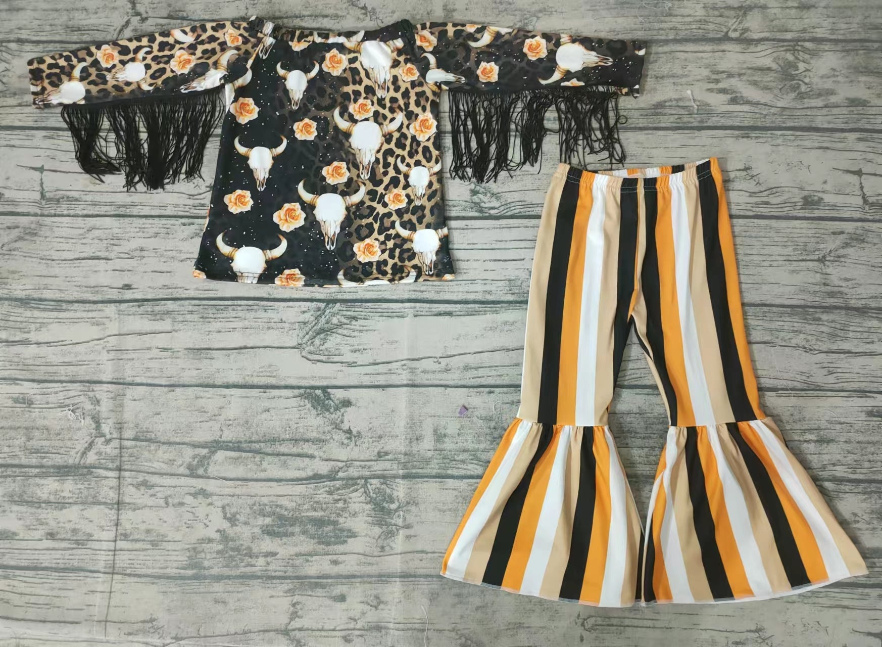 Baby girls leopard cow tassel top stripe bell pants clothes sets