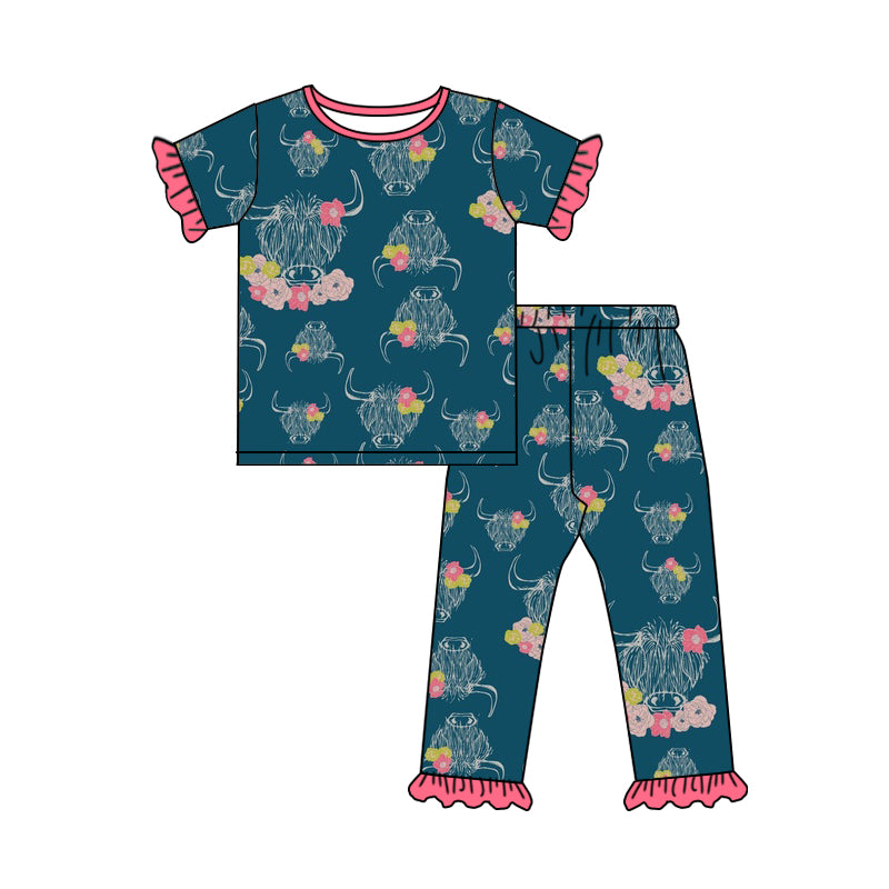 Baby Girls Navy Highland Cow Flowers Shirt Pants Pajamas Preorder(moq 5)