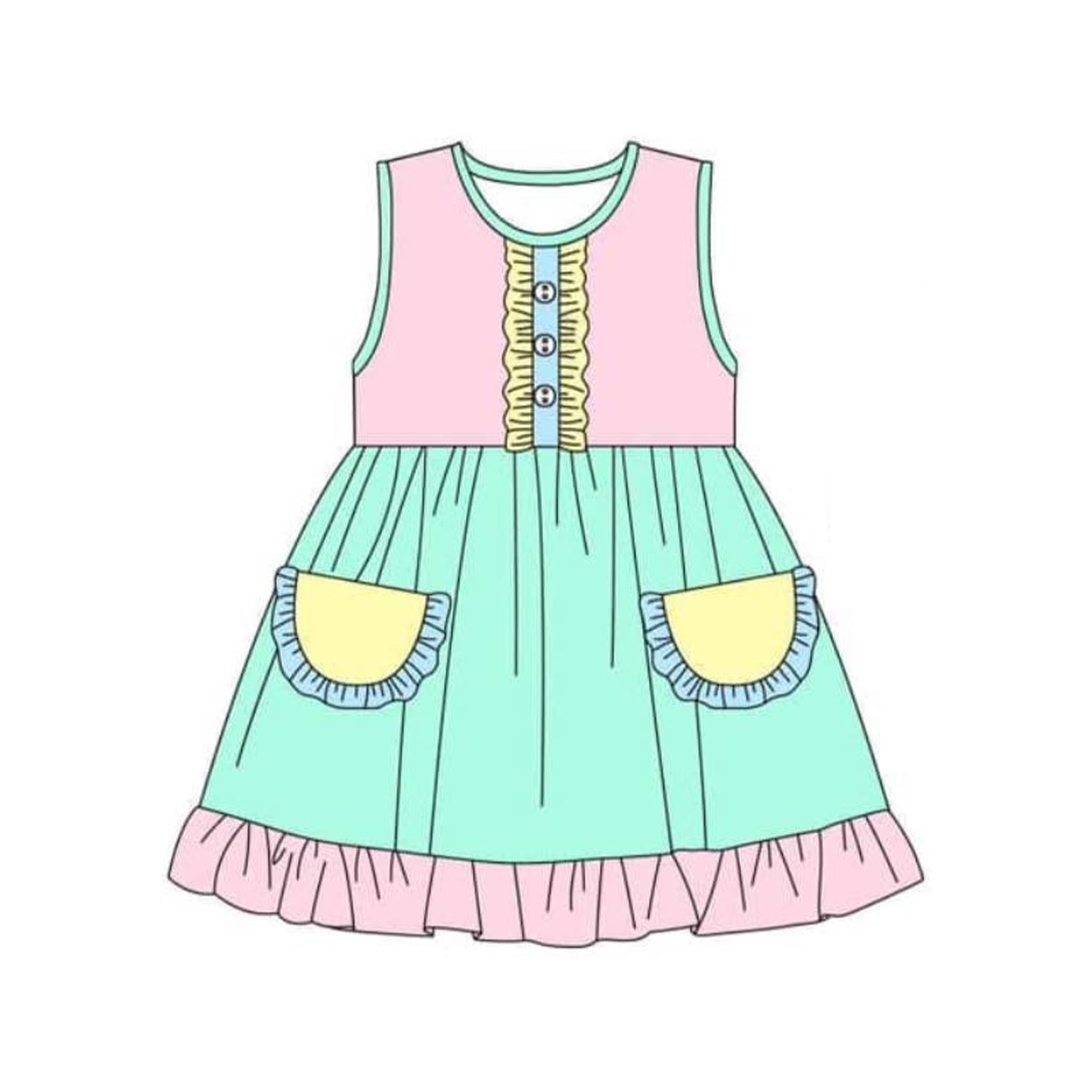 Baby Girls Pink Green Pockets Knee Length Dresses Preorder