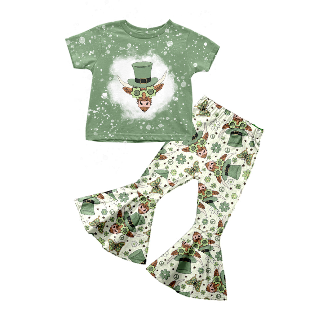 Baby Girls Short Sleeve St Patrick Day Highland Cow Tee Shirt Bell Pants Clothing Sets Preorder(moq 5)
