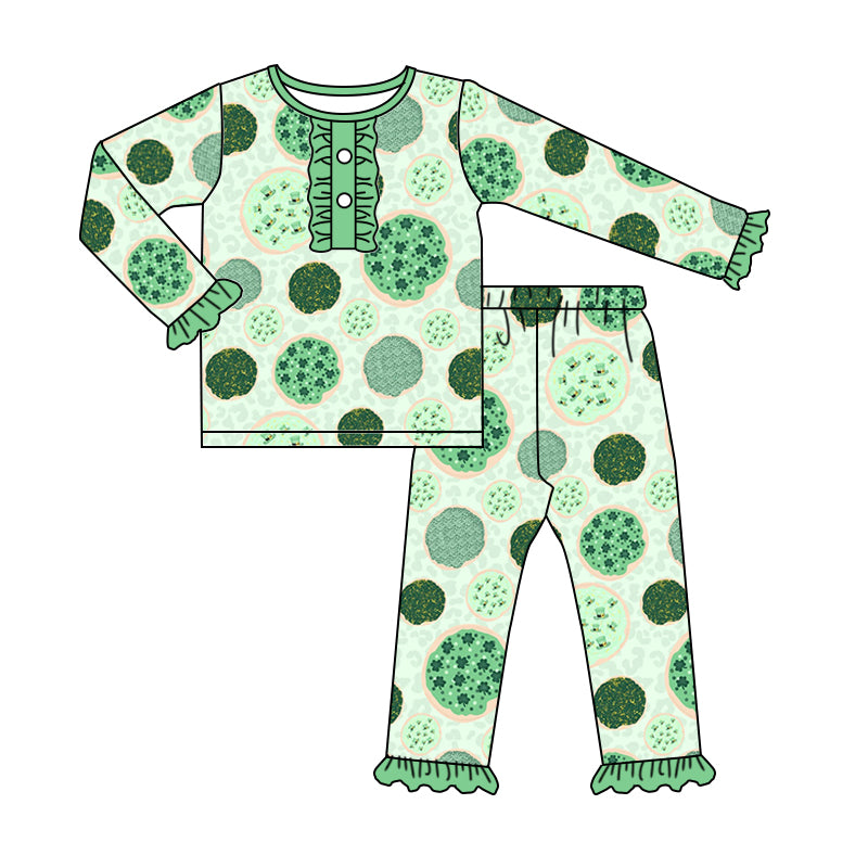 Baby Girls St Patrick Day Quatrefoil Long Sleeve Tee Ruffle Pants Pajamas Clothing Sets Preorder(moq 5)