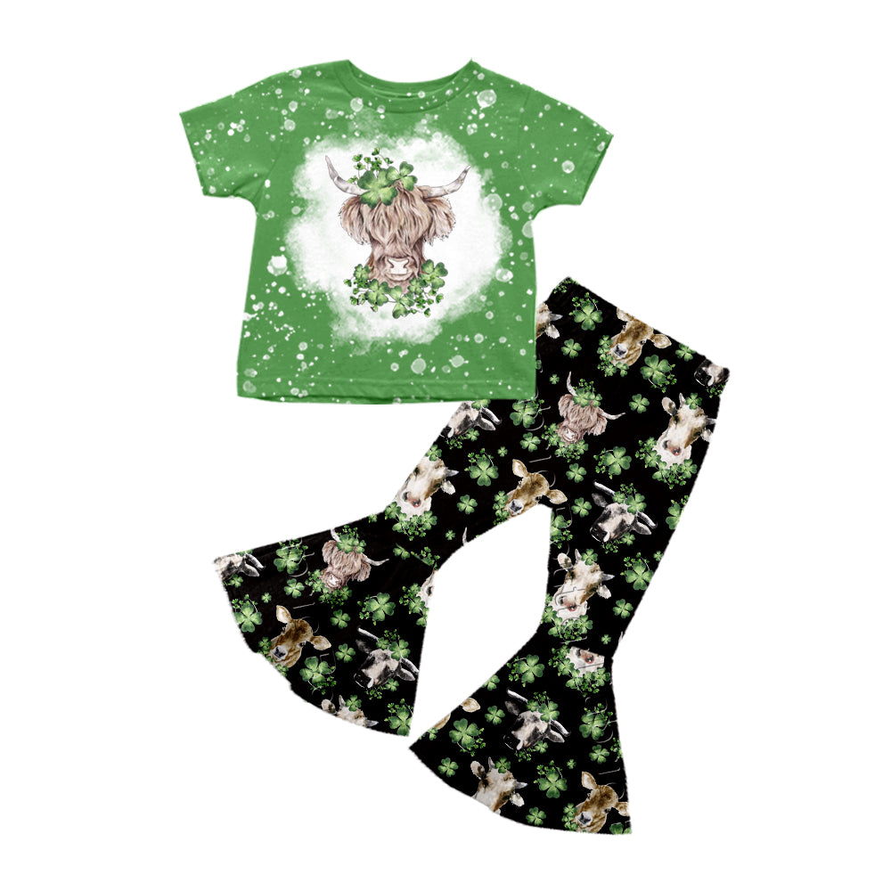 Baby Girls St Patrick Day Western Highland Cow Short Sleeve Tee Bell Pants Clothing Sets Preorder(moq 5)