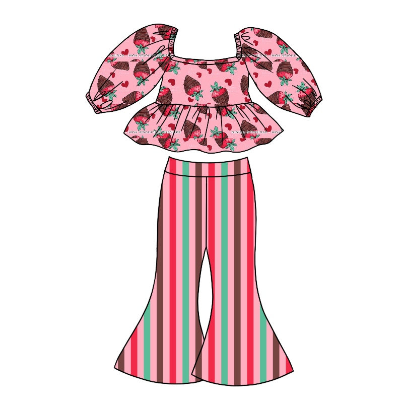 Baby Girls Valentines Strawberry Shirt Stripes Bell Pants Clothing Sets Preorder(moq 5)