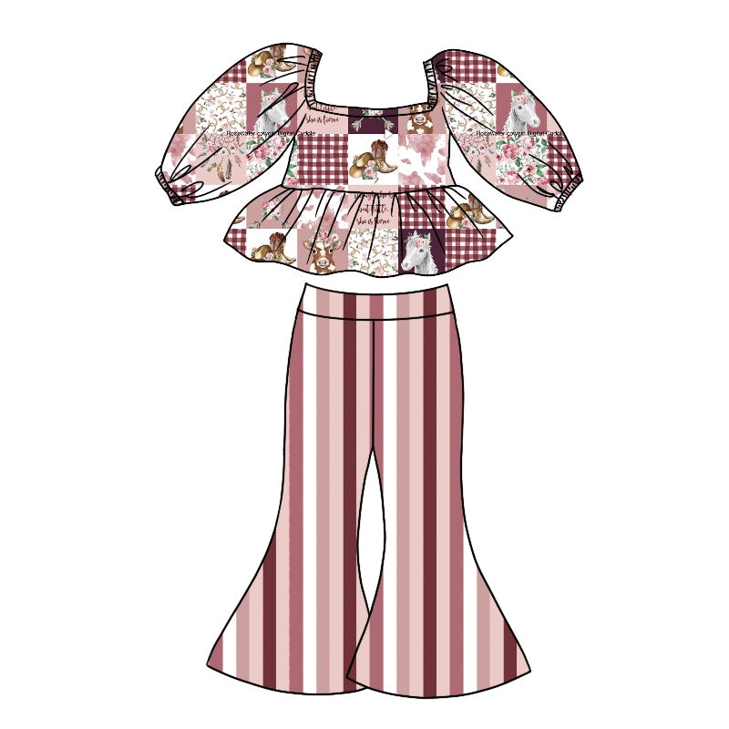 Baby Girls Western Horse Shirt Stripes Bell Pants Clothing Sets Preorder(moq 5)