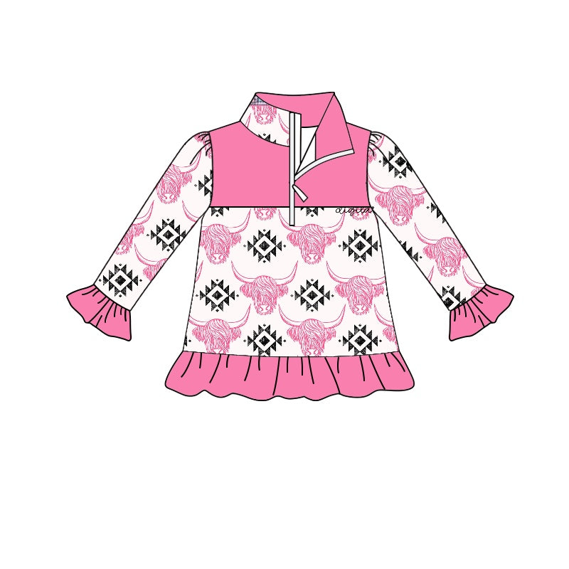 Baby Girls Western Pink Aztec Cow Ruffle Pullover Tops Preorder(moq 5)