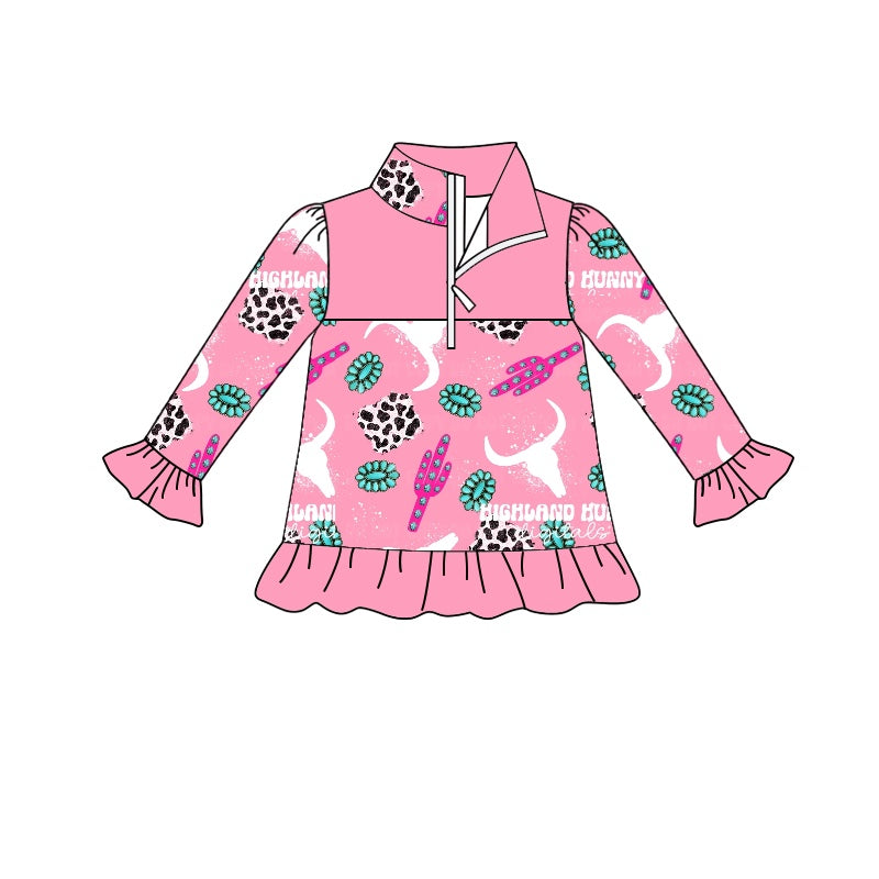 Baby Girls Western Pink Cactus Ruffle Pullover Tops Preorder(moq 5)