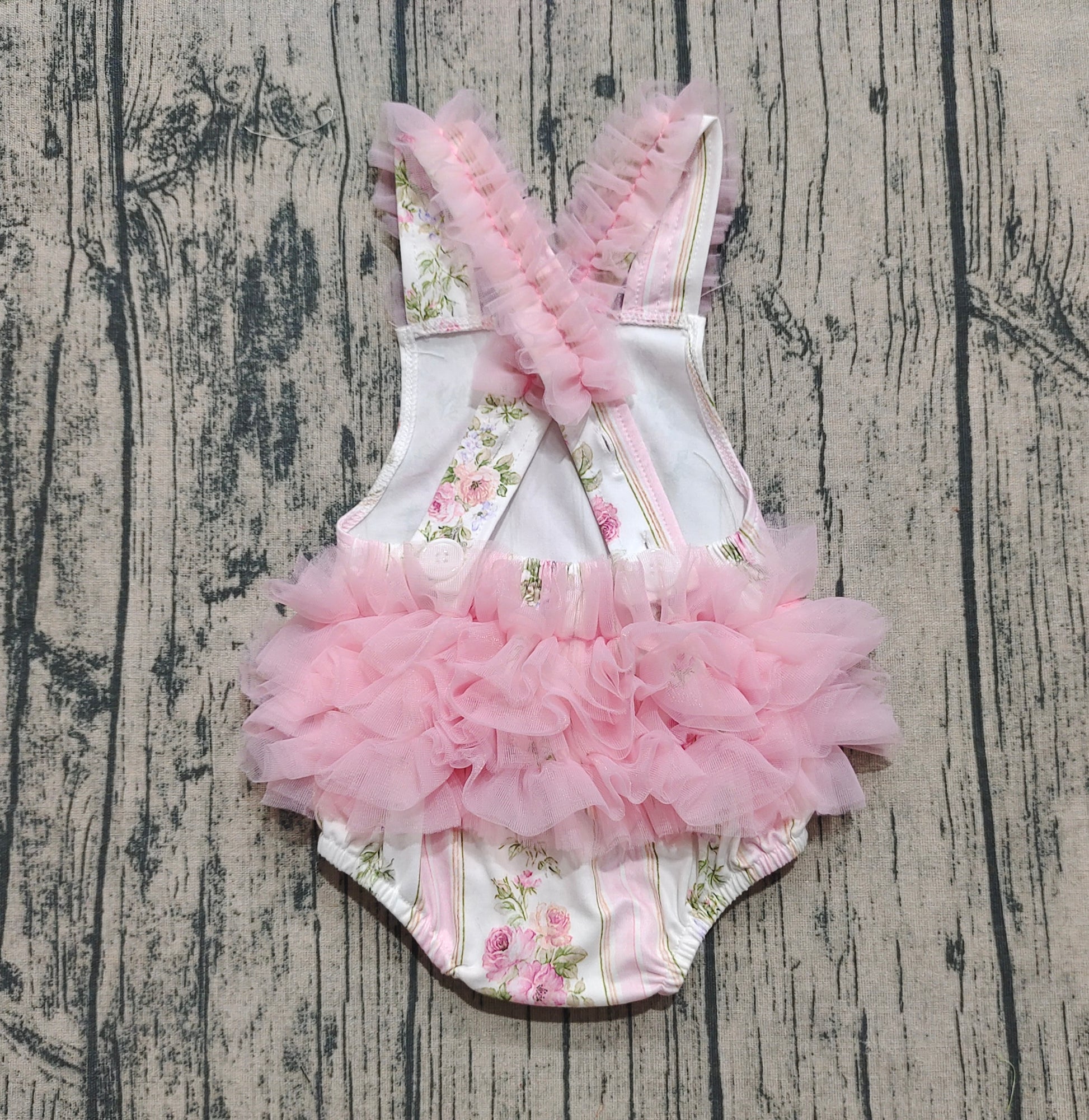 Baby Infant Girls Pink Tulle Strap Floral Stripe Ruffle Rompers