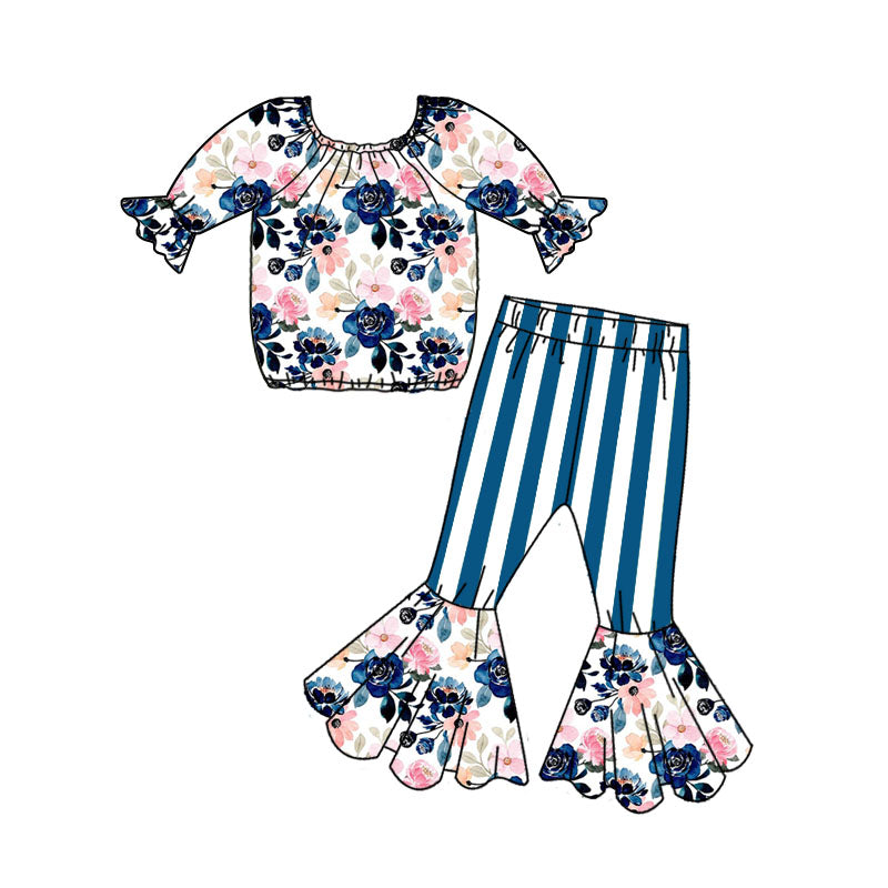 Baby Girls navy floral off shoulder top bell pants outfits sets