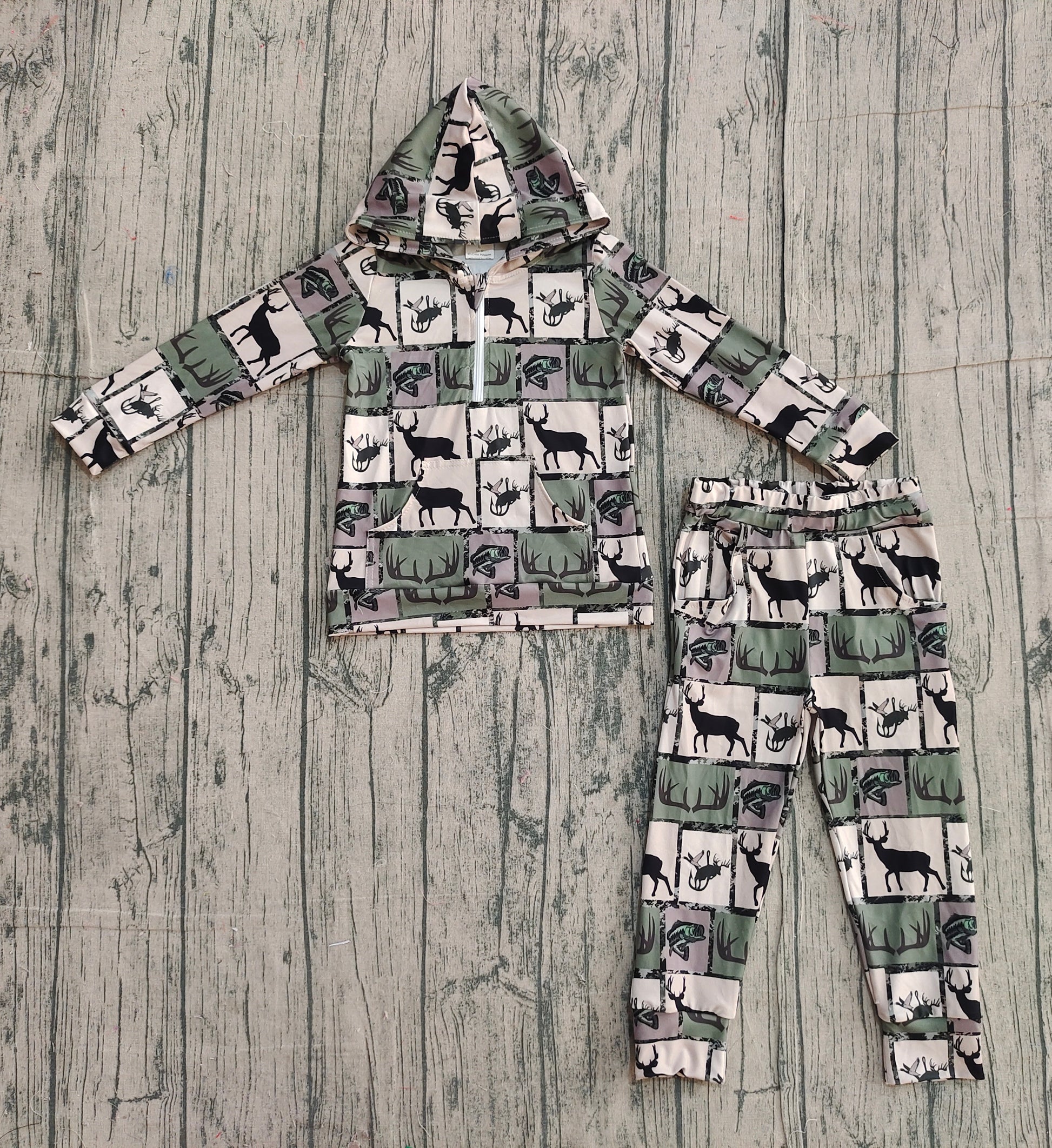 Baby Boys Deer Fishes Checked Zip Pockets Hoodies Pants Hunting Clothes Sets Preorder