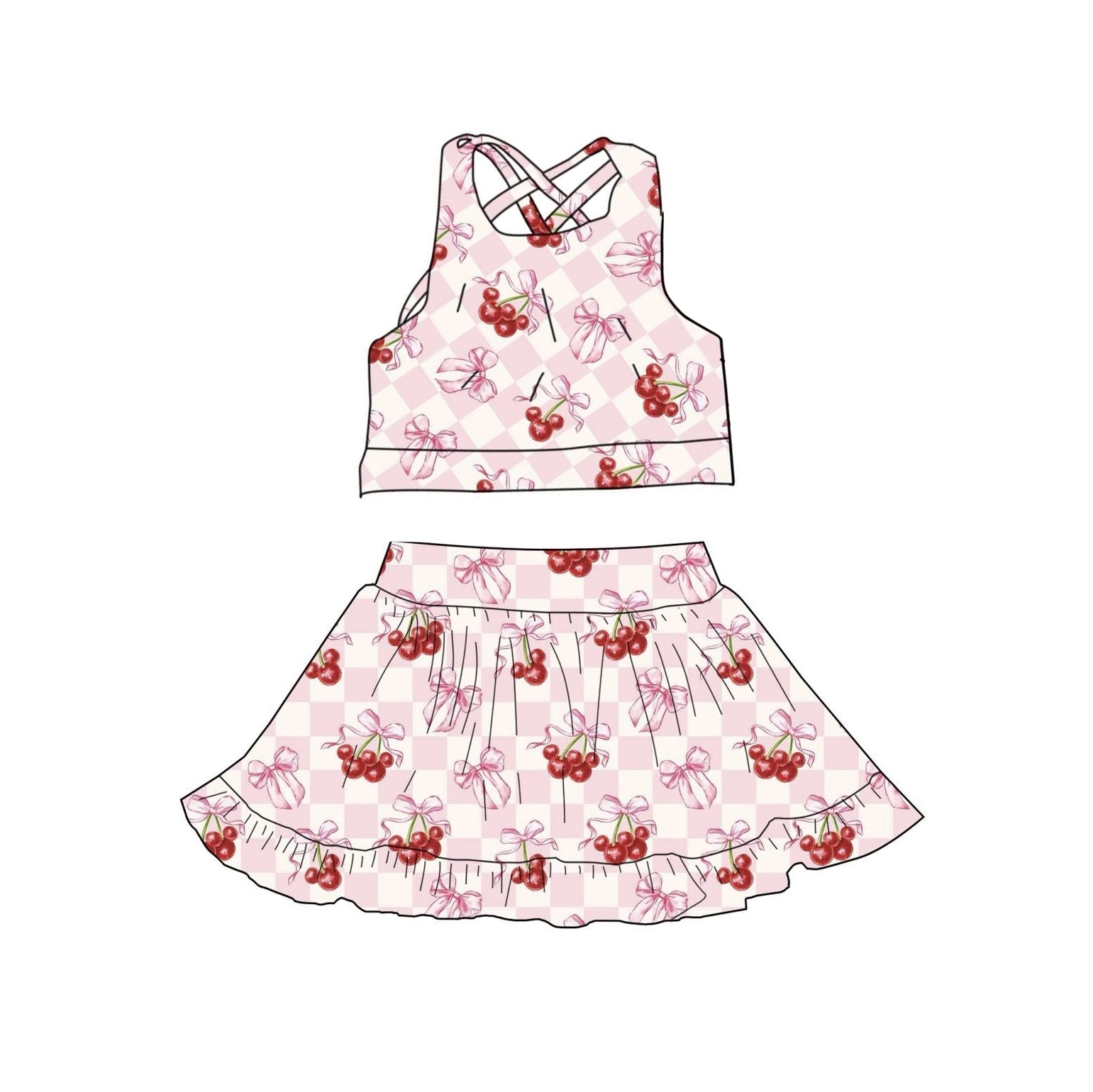Baby Girls Pink Checked Bow Cherry Vests Skirt Shorts Yoga Clothes Sets Preorder