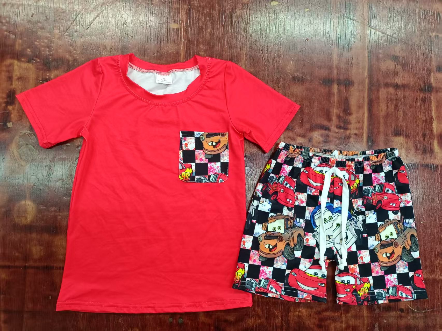 Preorder moq 5 Baby Boys Red Short Sleeves Pocket Top Cartoon Cars Short With Belt Set