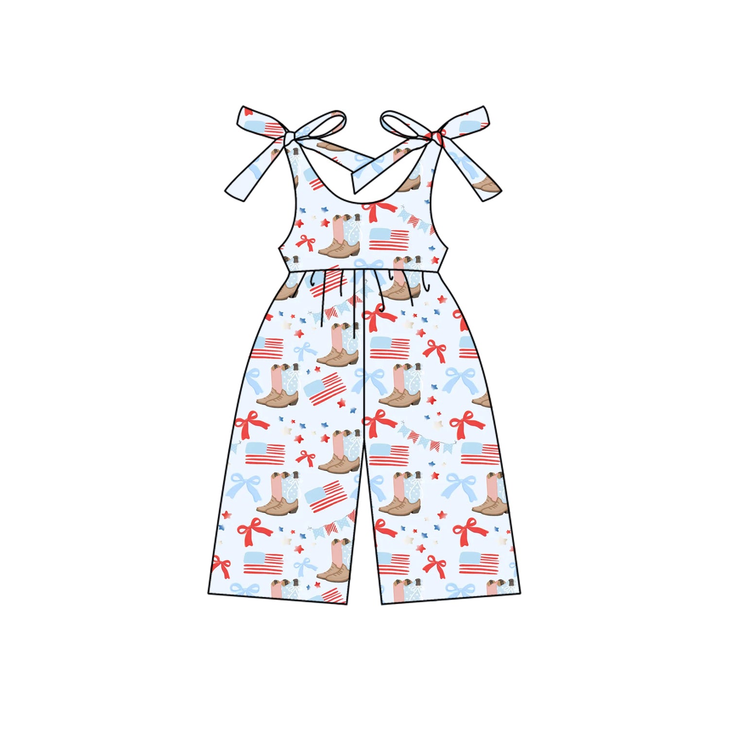 Preorder moq 5 Baby Girls Blue Strap Flags Boots Bows Bell Bottom 4th Of July Jumpsuits