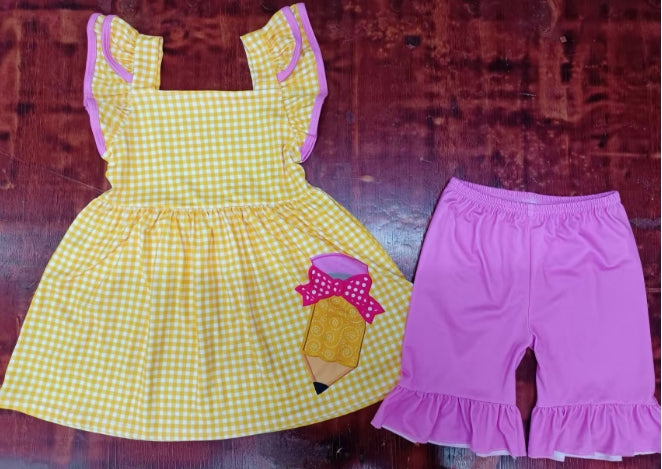 Preorder moq 5 Baby Girls Orange Plaid Flutter Sleeves Pencil Tunic Ruffle Short Back School Set
