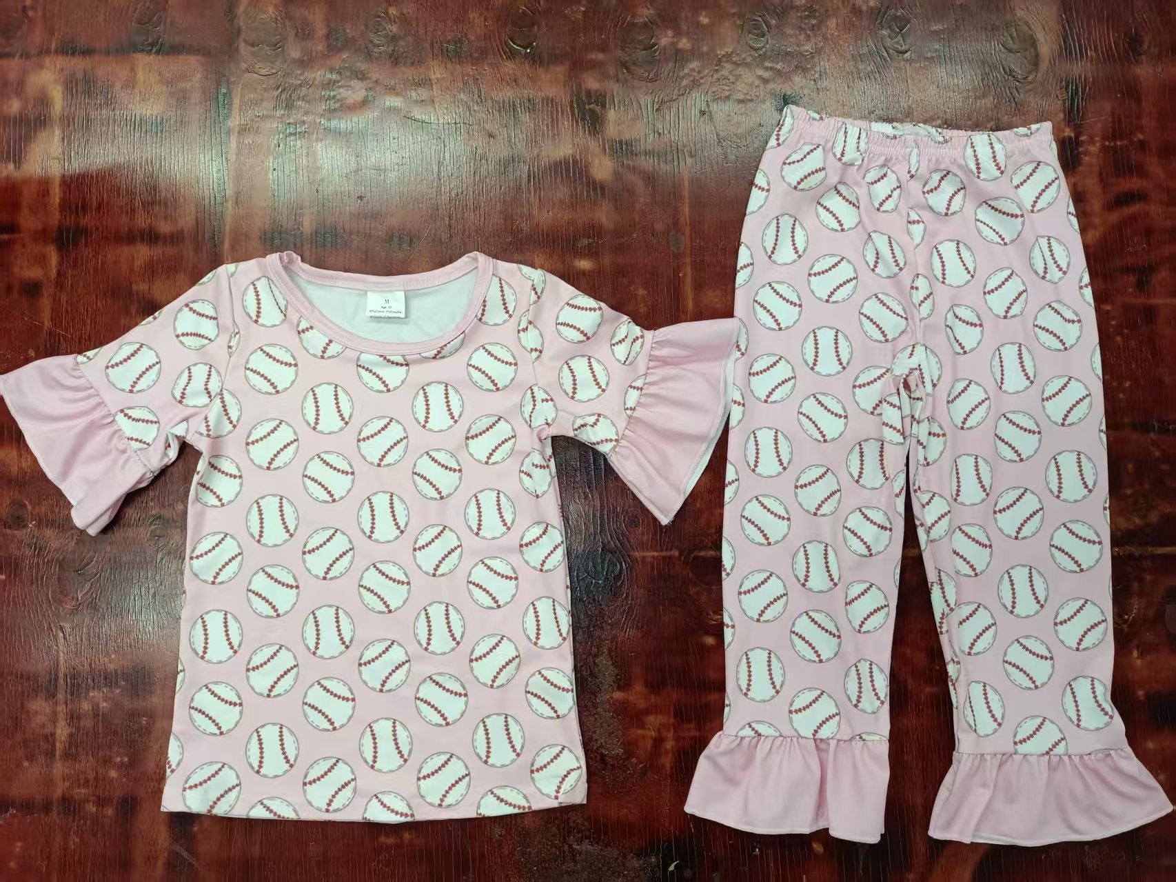 Preorder moq 5 Baby Girls Peach Short Ruffle Sleeves Baseballs Plaid Top Pant Pajamas Set